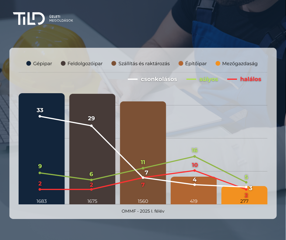 Halálos balesetek: 2024-ben 75; 2025 I. félévben 29. Ez az előző év azonos időszakához képest +7,4 %-os növekedést jelent. Aránytalanul sok a mikro- és kisvállalatoknál.